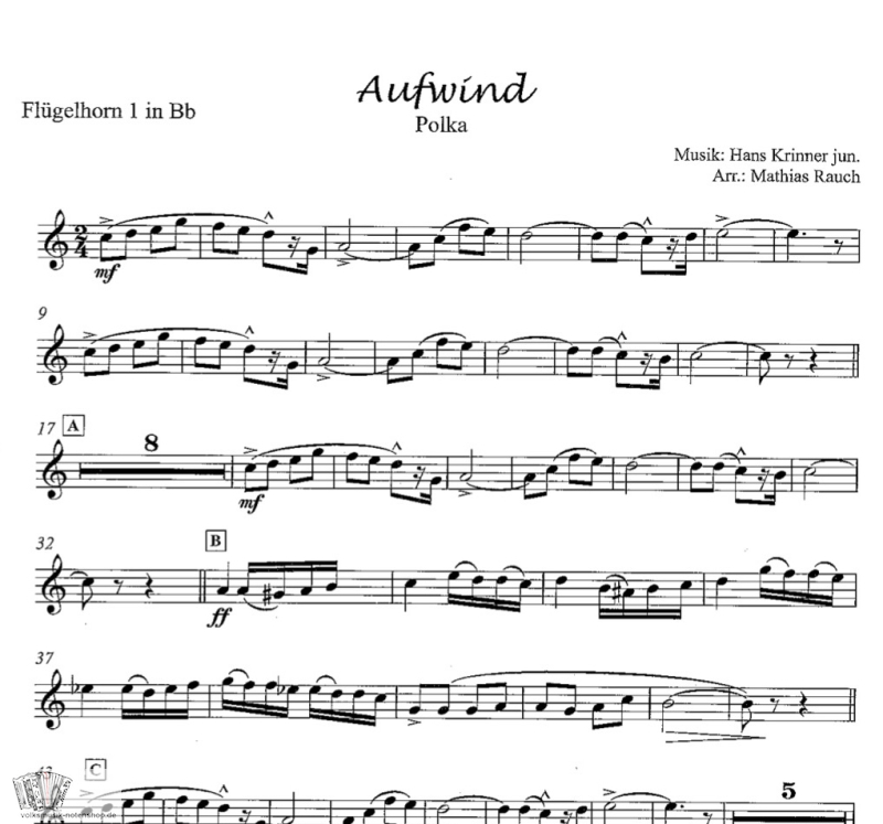 "Aufwind-Polka" für kleine Besetzung, von Hans Krinner bearbeitet von Mathias Rauch zum Download.